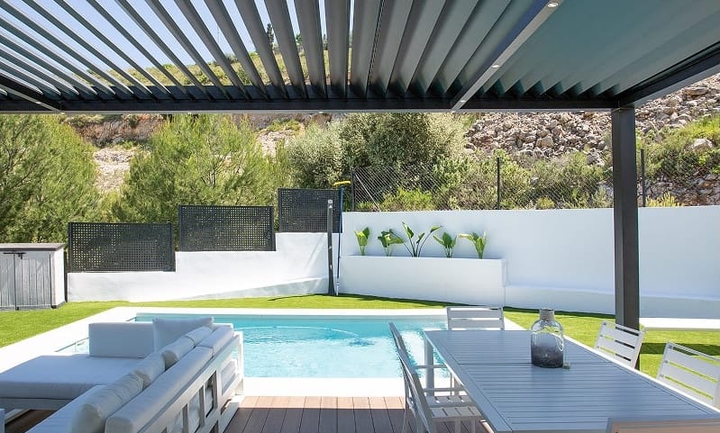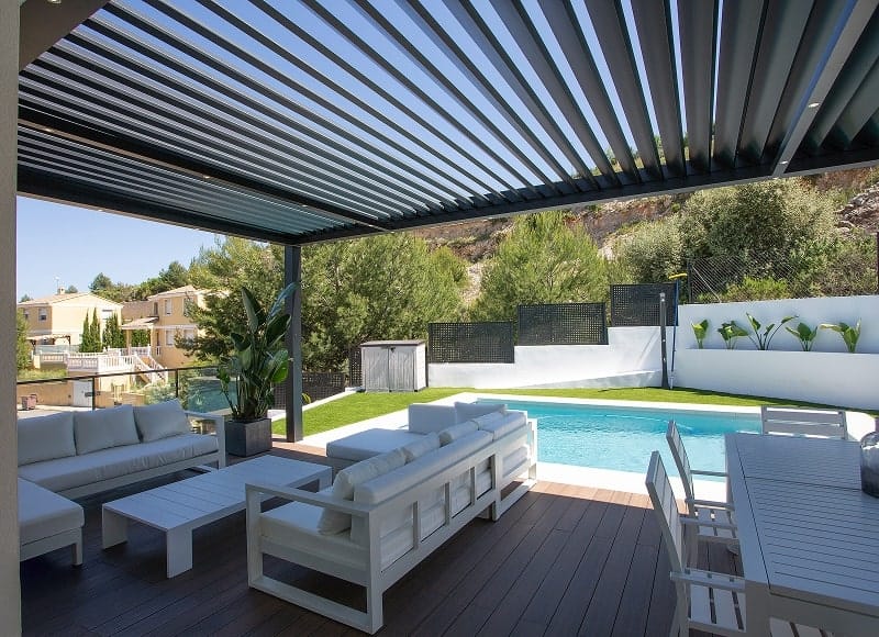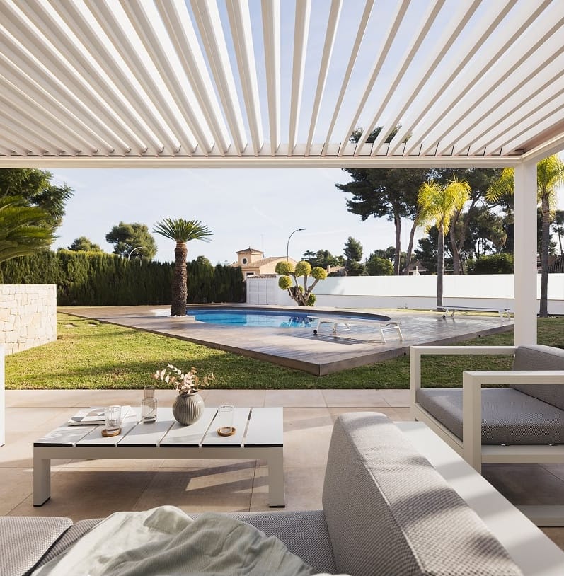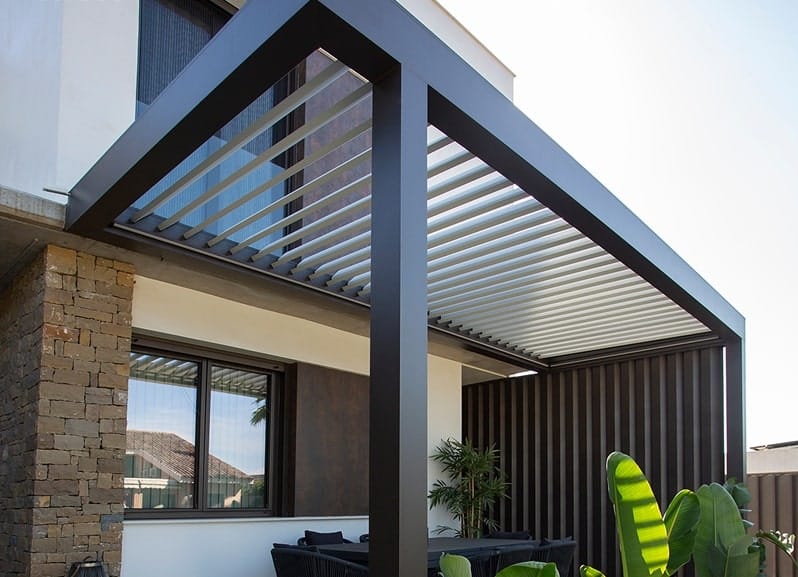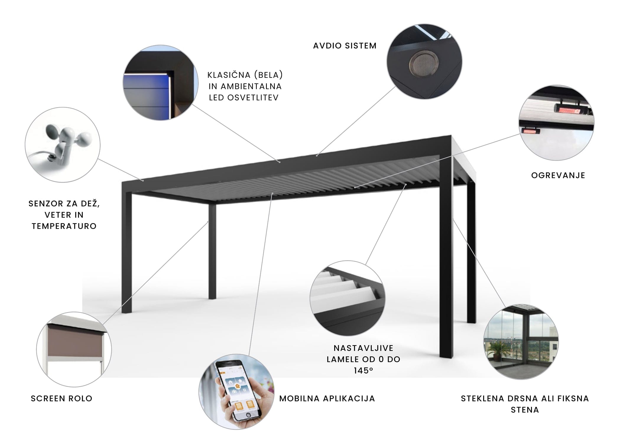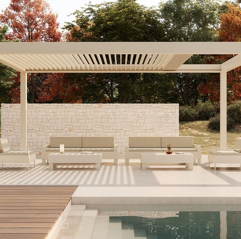 Bioklimatska pergola je napredna rešitev za senčenje, ki vam omogoča bivanje na prostem v vseh letnih časih. S pomočjo vrtljivih lamel omogoča naravno kroženje zraka in uravnavanje temperature. Pozimi prepušča sončne žarke, poleti pa nudi prijetno senco. Pergole Ethos so idealna izbira za zaščito pred soncem, dežjem in snegom, hkrati pa vaši terasi dodajo estetsko vrednost in funkcionalnost.