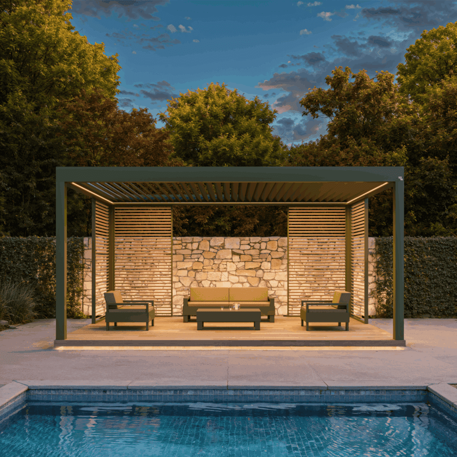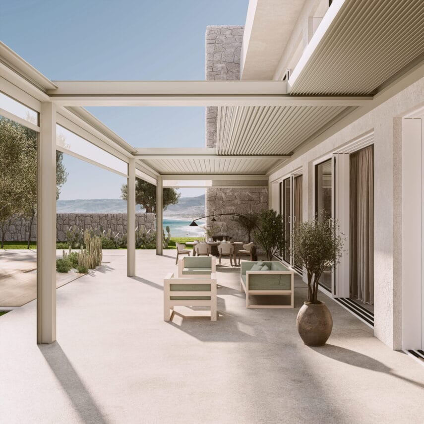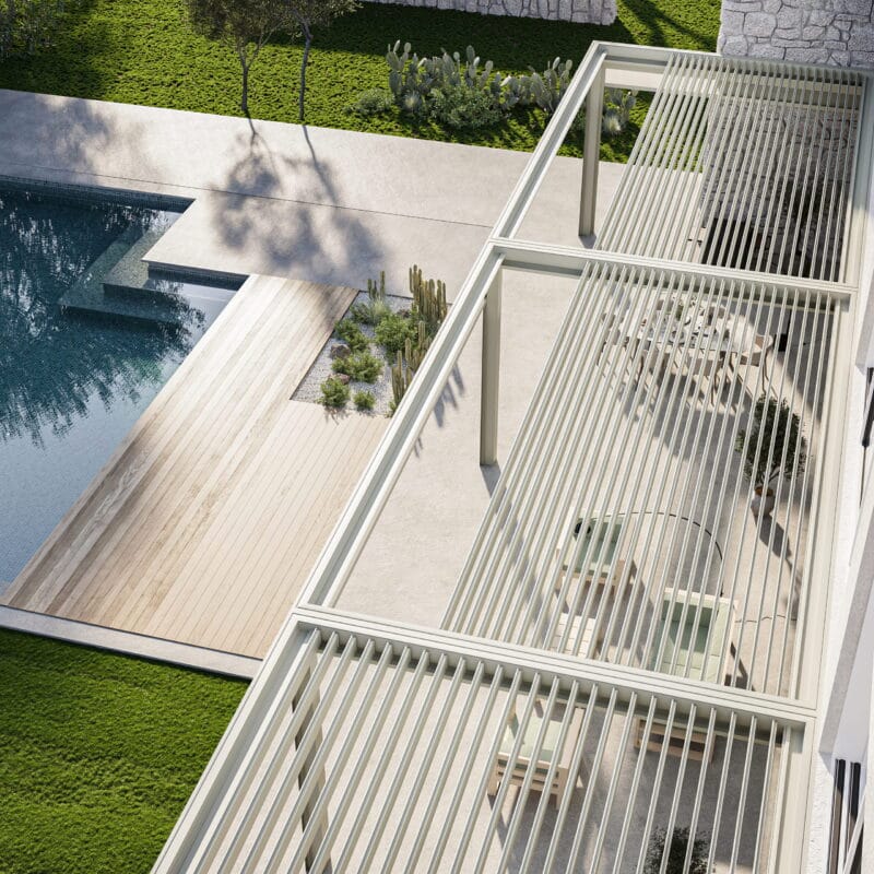 Bioklimatska pergola je napredna rešitev za senčenje, ki vam omogoča bivanje na prostem v vseh letnih časih. S pomočjo vrtljivih lamel omogoča naravno kroženje zraka in uravnavanje temperature. Pozimi prepušča sončne žarke, poleti pa nudi prijetno senco. Pergole Ethos so idealna izbira za zaščito pred soncem, dežjem in snegom, hkrati pa vaši terasi dodajo estetsko vrednost in funkcionalnost.